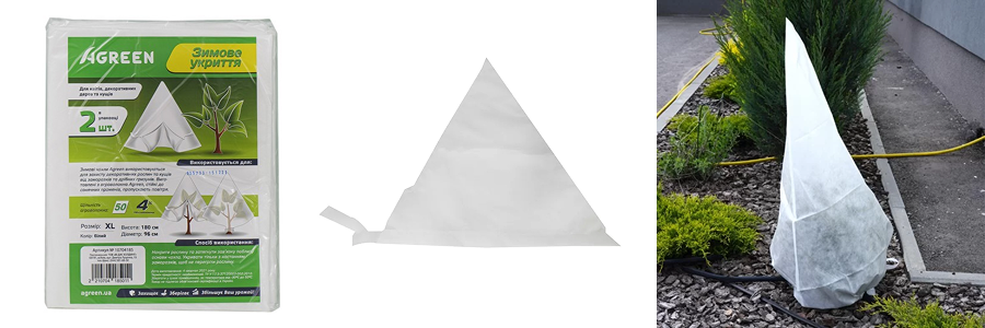 Найзручніше рішення для тих, хто не хоче витрачати час на каркаси — зимовий чохол Agreen. Це готове зимове укриття для дерев і кущів у формі конуса з міцного агроволокна (щільність близько 50 г/м²). Його достатньо просто надіти на рослину і зафіксувати біля основи. Білий дихаючий матеріал пропускає повітря, але зберігає тепло, запобігаючи промерзанню кореневої шийки та гілок.